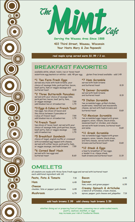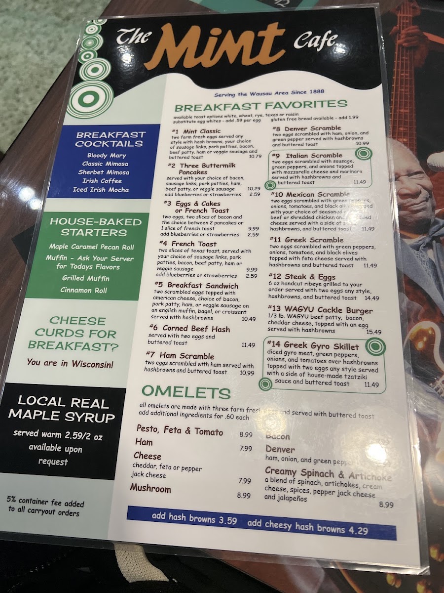Welcome to the bold and flavorful world of The Mint Cafe Menu, located in the heart of Wausau, Wisconsin. If you're looking for a cozy spot to enjoy a delicious meal, you've found it. From breakfast to dinner, each dish is carefully crafted to offer something for everyone. Whether you're in the mood for a fresh salad, a hearty sandwich, or a sweet treat to round out your meal, The Mint Cafe has it all. The menu features a variety of options made from high-quality ingredients, ensuring each bite is packed with flavor. With a welcoming atmosphere and a focus on fresh, local ingredients, this is a place where food and good vibes come together. So sit back, relax, and explore all the mouthwatering choices awaiting you on the The Mint Cafe Menu.